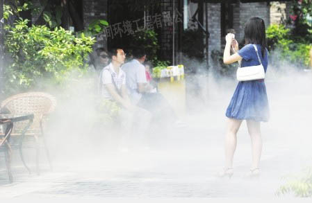 有了噴霧降溫系統(tǒng),就可以局部地控制大環(huán)境的溫度。噴霧降溫系統(tǒng)散發(fā)到空氣中的水微粒,在汽化的過程中要吸收大量周圍環(huán)境中的熱量,從而降低周圍環(huán)境的溫度,是防暑降溫的有效手段。在盛夏,當(dāng)城市氣溫達(dá)到35℃以上時(shí),即使打著傘,戴著太陽鏡,來自太陽的直射和來自地面的反射,依然讓人感覺酷暑難當(dāng)。而在噴霧降溫系統(tǒng)的作用下,空氣溫度可降至25℃,在極端環(huán)境下可降溫14℃,達(dá)到人體的最佳溫度,所以即使置身炎熱室外,依然感到舒暢。